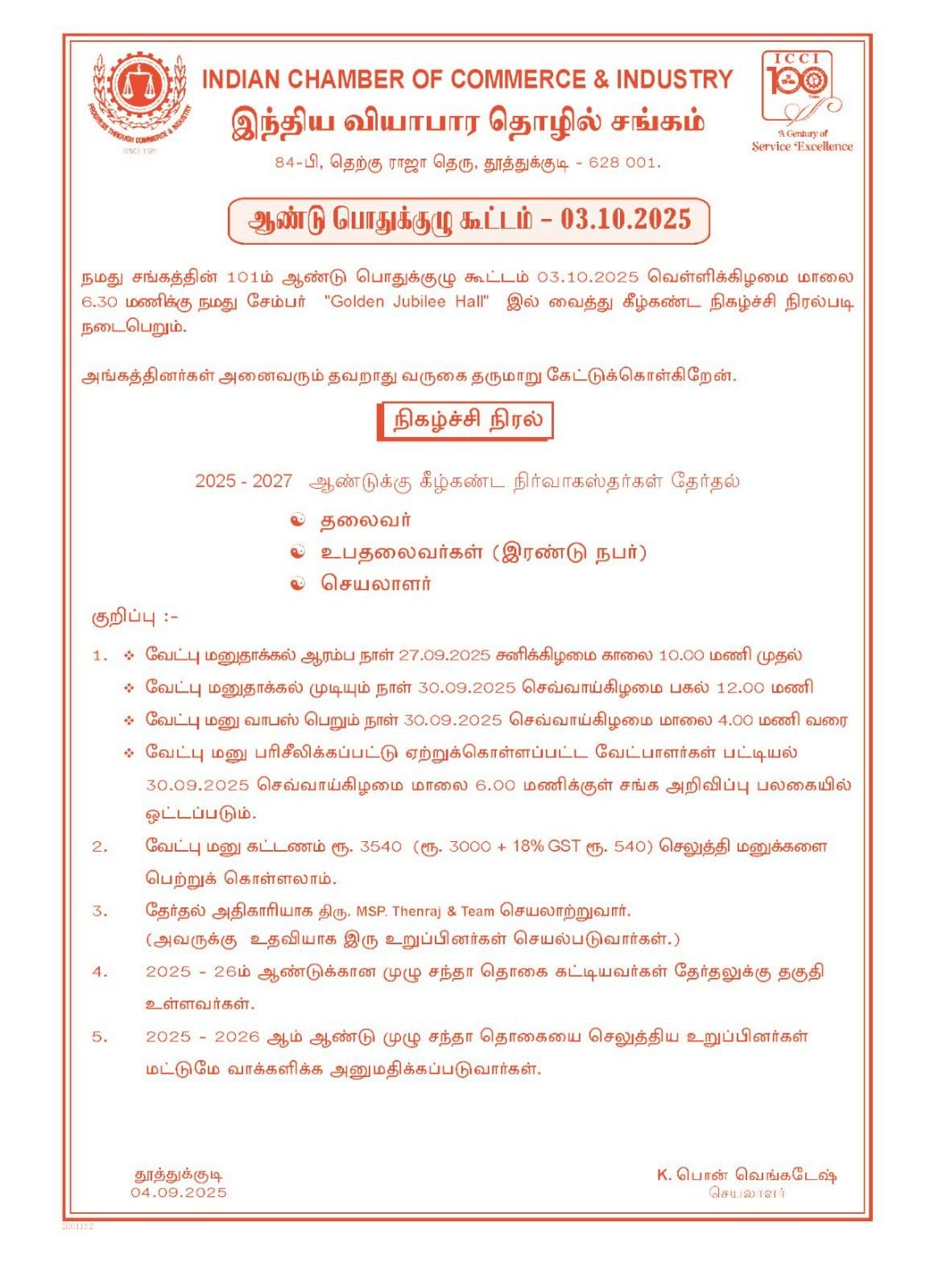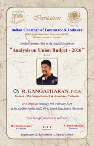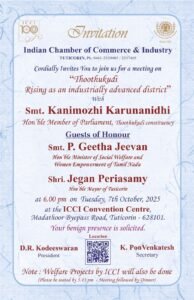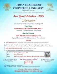 The Merchants’ Association was established in June 1913 to serve as a forum to speak for and protect the interests of merchants, and its activities were confined to local issues. After the world war, realizing the need to reshape the economy, the Associations’s activities were restructure and with the willing co-operation of the local trade, the name of Merchants’ Association was changed to “Indian Chamber of Commerce, Tuticorin” was brought into being in may 1922.