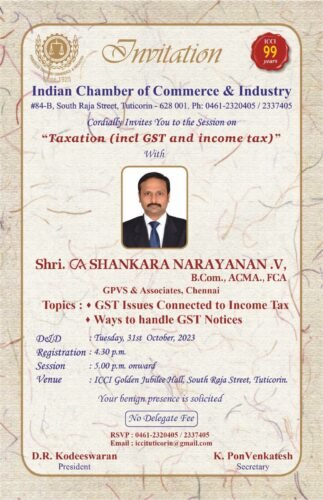 Kindly attend this meeting ‘Taxation ( incl GST and Income tax “and also depute your Financial/ Accounts staffs to attend this important meeting and be benefited. Pl register the participants names ( No delegate fees ) Our ICCI President Shri D.R. KODEESWARAN and Jt Secretary Shri Arulraj Solomon had Meeting with our new District Collector Thiru G. Lakshmipathy, IAS,and presented Memorandum on Industrialisation « ‹ of 24 › »