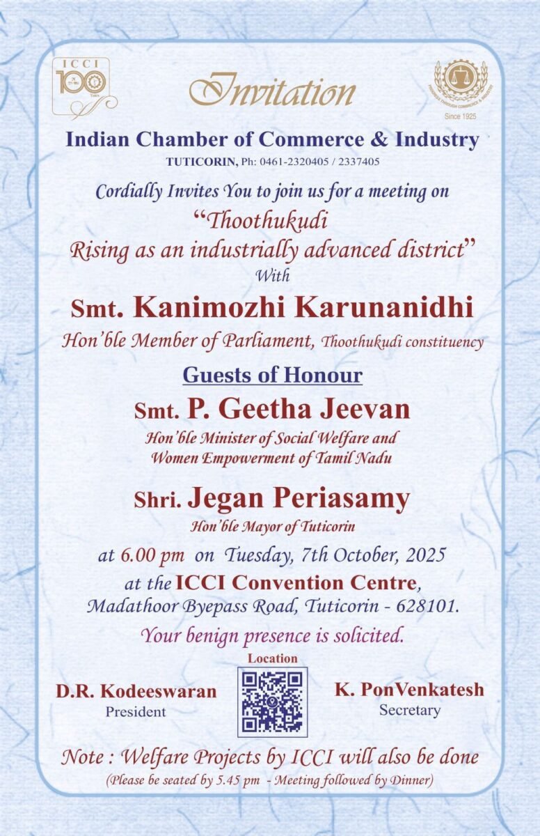 Today Wednesday, ICCI members met our New Tuticorin Municipal Corporation Commissioner S.Priyanka IAS., madam in her office and presented our chamber Memorandum .. Today Wednesday, ICCI members met our New Tuticorin Municipal Corporation Commissioner S.Priyanka IAS., madam in her office and presented our chamber Memorandum .. IMG-20250823-WA0001 IMG-20250823-WA0002 IMG-20250823-WA0003 « ‹ of 22 › »